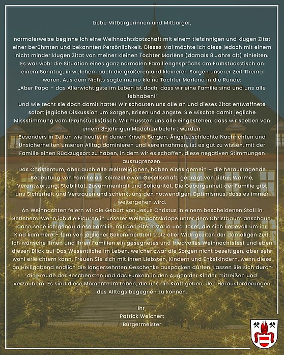 Über die Weihnachtsfeiertage und den Jahreswechsel, ist das Rathaus am Mittwoch, 24. Dezember 2025, sowie von Mittwoch, 31. Dezember 2025 bis Dienstag, 06. Januar 2026 den ganzen Tag geschlossen.