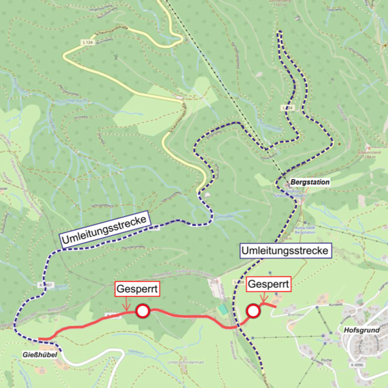 In diesem Zusammenhang werden zeitweise auch die beiden Parkflächen entlang der Straße im Bereich des Berggasthofs Gießhübel sowie die Einfahrt in den Waldweg in Richtung Kaltwasser gesperrt.