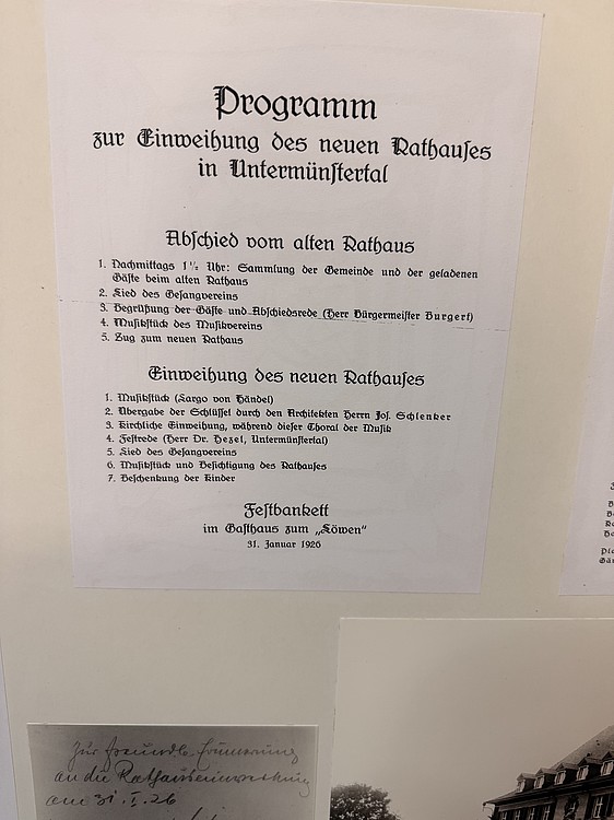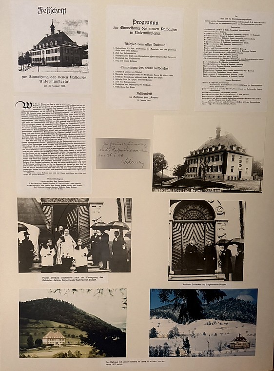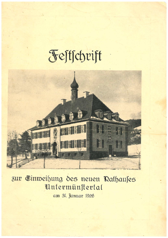 Im Jahr 1926 wurde das neue Rathaus in Untermünstertal feierlich eingeweiht. Anlässlich dieses besonderen Ereignisses entstand eine Festschrift, die nicht nur den Ablauf der Einweihung dokumentiert, sondern auch die Bedeutung des Rathauses für die Gemeinde eindrucksvoll widerspiegelt.
