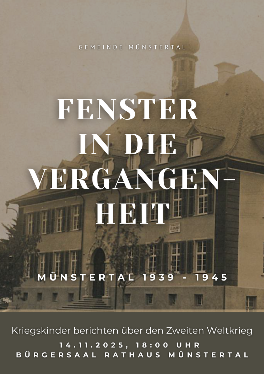 Am Freitag, den 14. November 2025, wird um 18:00 Uhr im Bürgersaal des Rathauses Münstertal die Ausstellung „Fenster in die Vergangenheit – Münstertal von 1939–1945“ eröffnet.